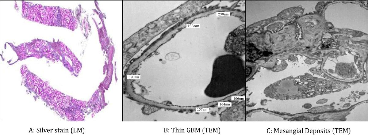 Figure 1: Light microscopy (silver stain, low magnification) showing mesangial expansion, segmental sclerosis, and moderate glomerulosclerosis (Figure 1A). Transmission electron microscopy demonstrating diffusely thin glomerular basement membranes (mean 217 nm; range 153–328 nm) without lamellation or splitting. While not diagnostic on its own, these findings suggest thin basement membrane disease and correlate with a genetically confirmed COL4A3 mutation consistent with autosomal dominant Alport syndrome (Figure 1B). Transmission electron microscopy reveals small mesangial electron-dense deposits and segmental podocyte foot process effacement, consistent with IgA nephropathy (Figure 1C).
