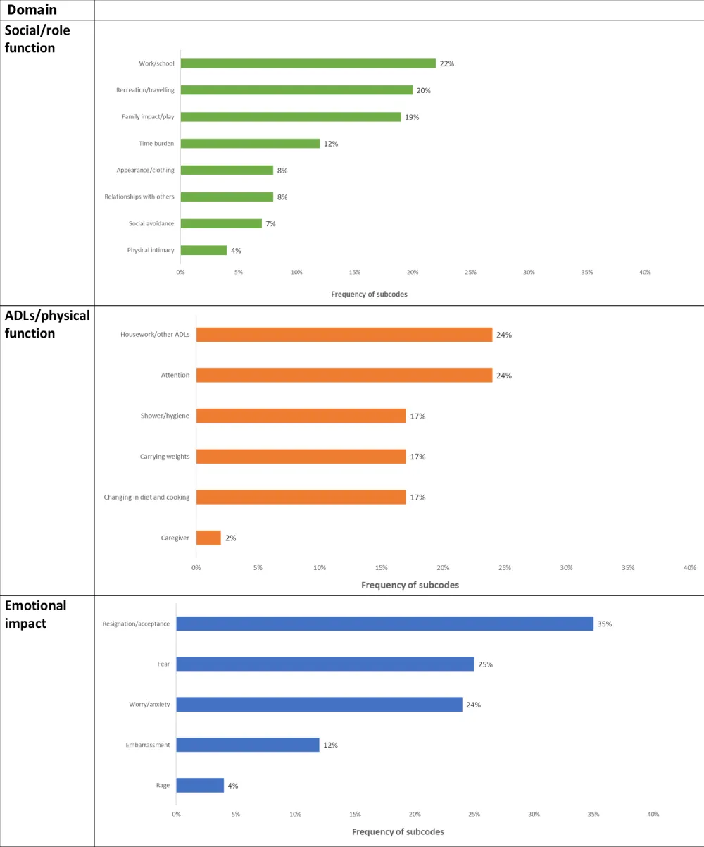 Regarding the three most relevant domains, the results are comparable with those reported by Nordyke et al. 2020. However, differences in the social/role function, ADLs/physical function, and emotional impact were observed, particularly in appearance/clothing (8 mentions versus 33 mentions, respectively), social avoidance (7 versus 29, respectively), and work/play (19 versus 5, respectively). These variations in worry/anxiety (17 versus 75, respectively) may likely be attributed to differences in the sample characteristics.
