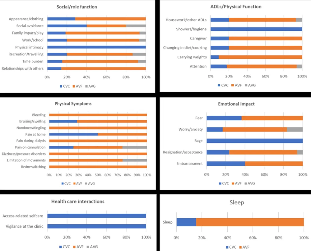 Regarding physical symptoms, such as bleeding, numbness/tingling, pain during dialysis, dizziness/pressure disorders, and redness/itching, the impact of AVF was greater than CVC and AVG. The lowest rate of physical symptoms was reported for AVG.